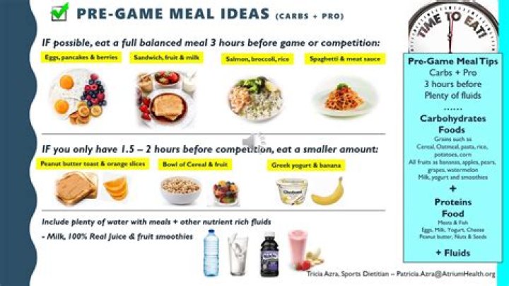 Athletes should eat a balanced meal containing carbohydrates, protein, and fruit or vegetables 2-3 hours before game time. Make sure to drink 12-24 ounces of water with a pre-game meal to stay hydrated. Pre-game meals may include: Whole wheat chicken sandwich with vegetables.