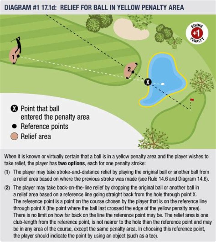 When it is known or virtually certain that a ball is in a yellow penalty area and the player wishes to take relief, the player has two options, each for one penalty stroke: (1) The player may take stroke-and-distance relief by playing the original ball or another ball from a relief area based on where the previous ...
