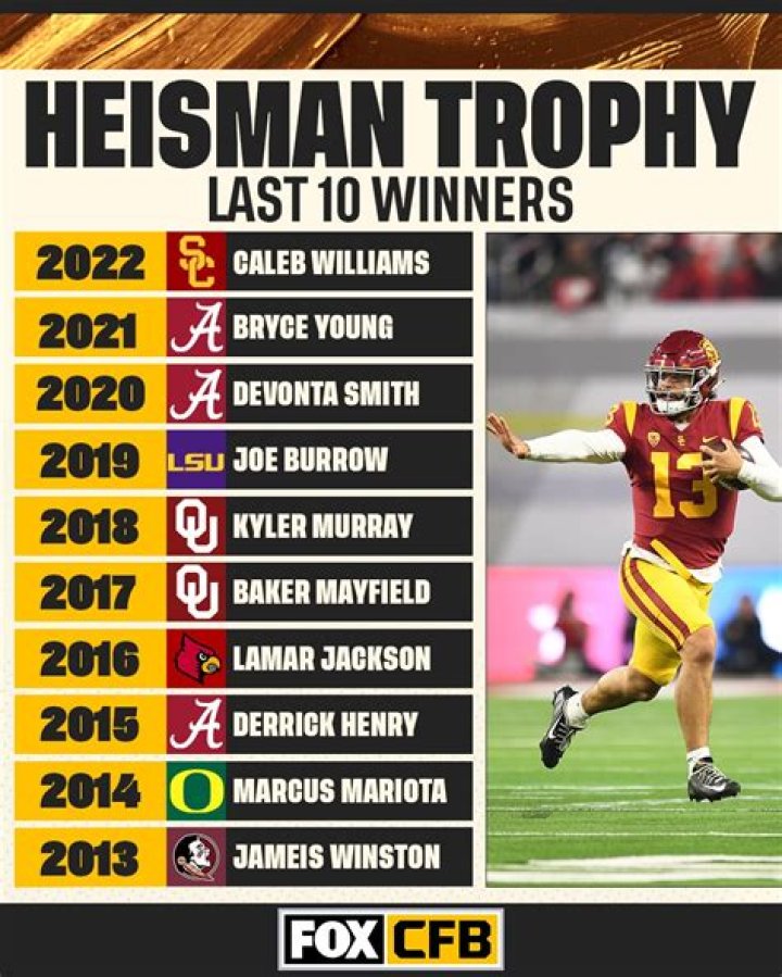 A school has had a Heisman winner in back-to-back years six times, though one of those awards is Bush's forfeited trophy (Yale 1936–37, Army 1945–46, Ohio State 1974–75, USC 2004–05, Oklahoma 2017–18 and Alabama 2020–21).