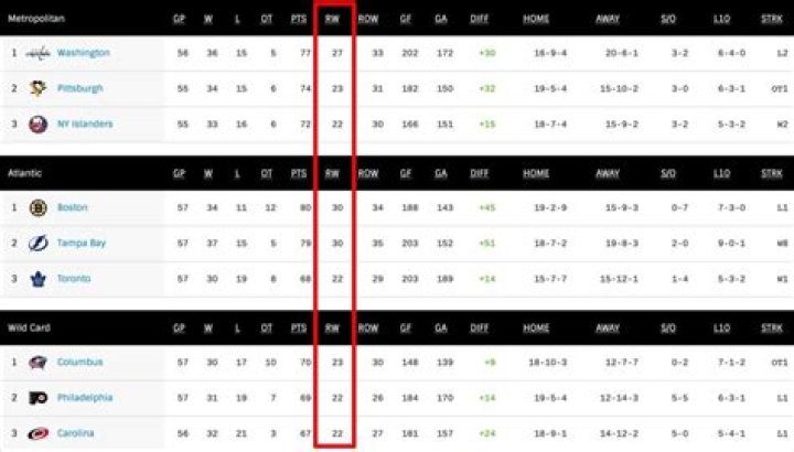 The three numbers represented are Wins-Losses-OT, for example 20-10-3, which translates to 20 wins, 10 losses, and 3 overtime/shootout losses.