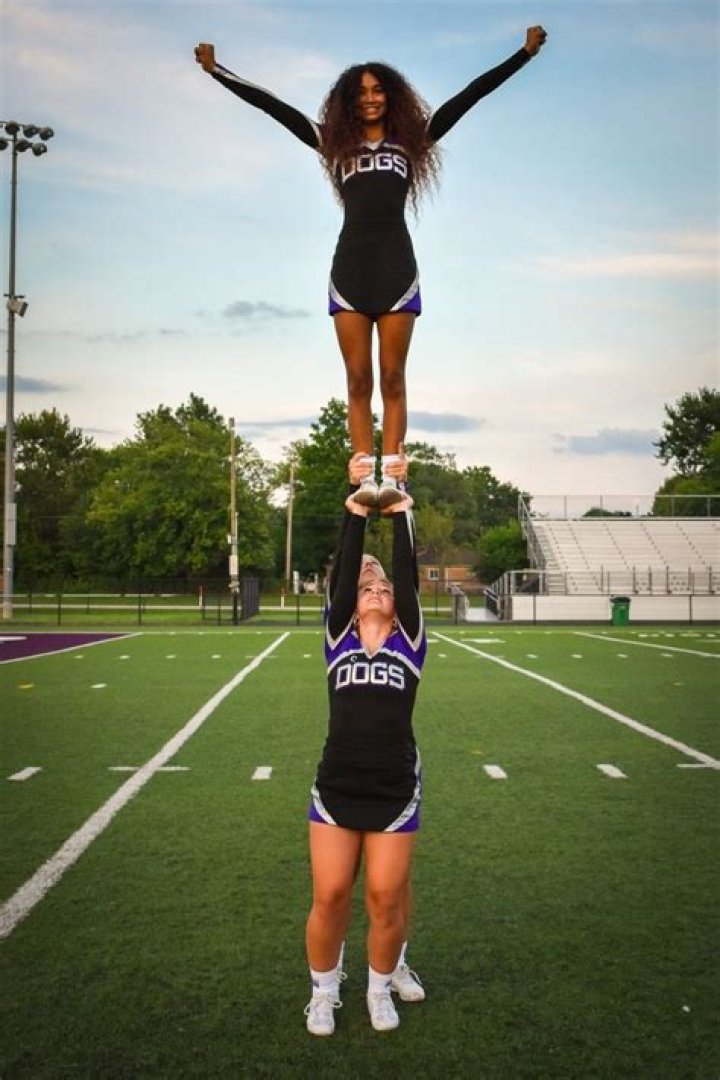 The top girl, or flyer, is the one lifted and thrown in the air during stunts. They energetically twist and flip mid-air, placing trust in their bases and spotters to safely catch them.